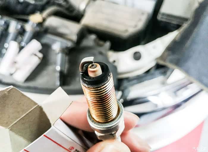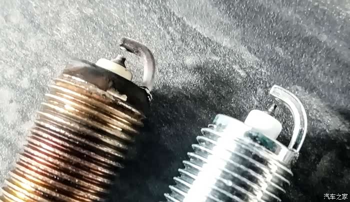 新旧对比:原车的火花塞间隙明显比新的要大,点火尖也要粗上很多。