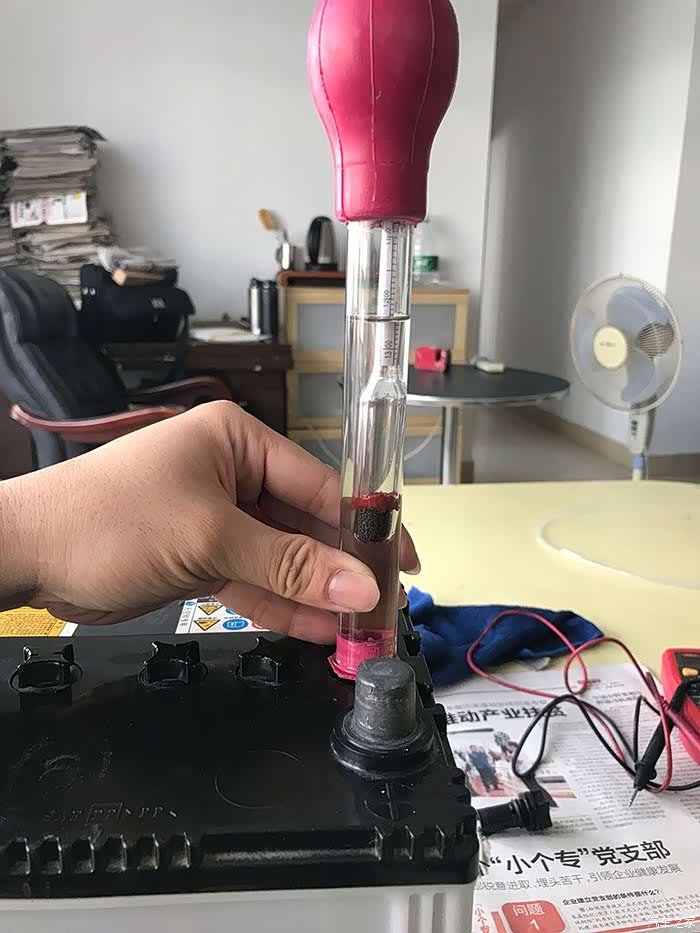 这时用电解液比重计测量了一下电瓶的电解液比重(图片拿回以前的图,只作示意)