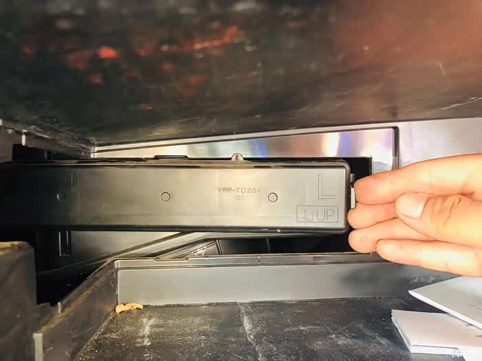 拿掉挡板就可以看到空调滤芯盖板,用力按压盖板两侧的固定卡扣,盖板就可以取下。向外侧抽出旧的空调滤芯。