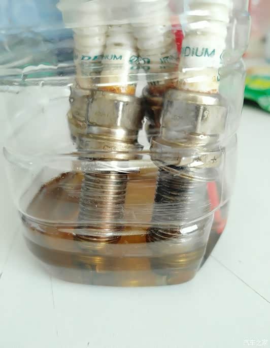 车小将尾气清洁剂泡的火花塞,泡了3个小时,泡下不少积碳。