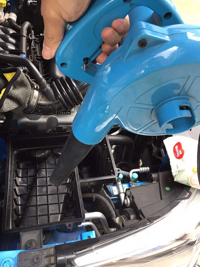 清洗好节气门用个橡胶手套把节气门口部套住避免灰尘进入,开始用吹尘鼓风机吹掉空滤箱内的杂物和沙子。