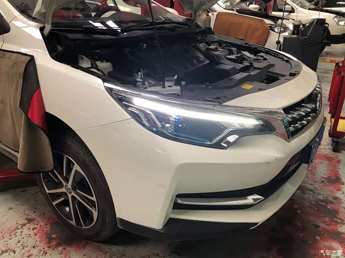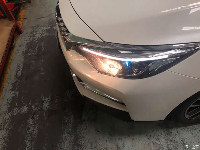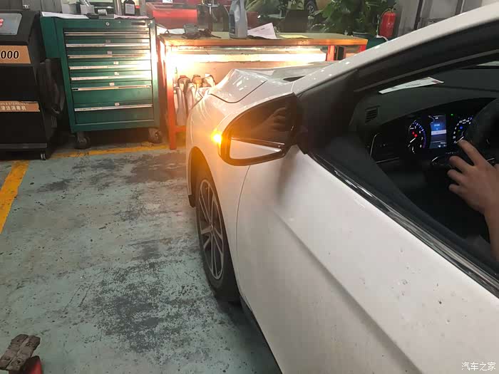 把车停在车架上后,工作人员开始检查灯光,日间行车灯ok