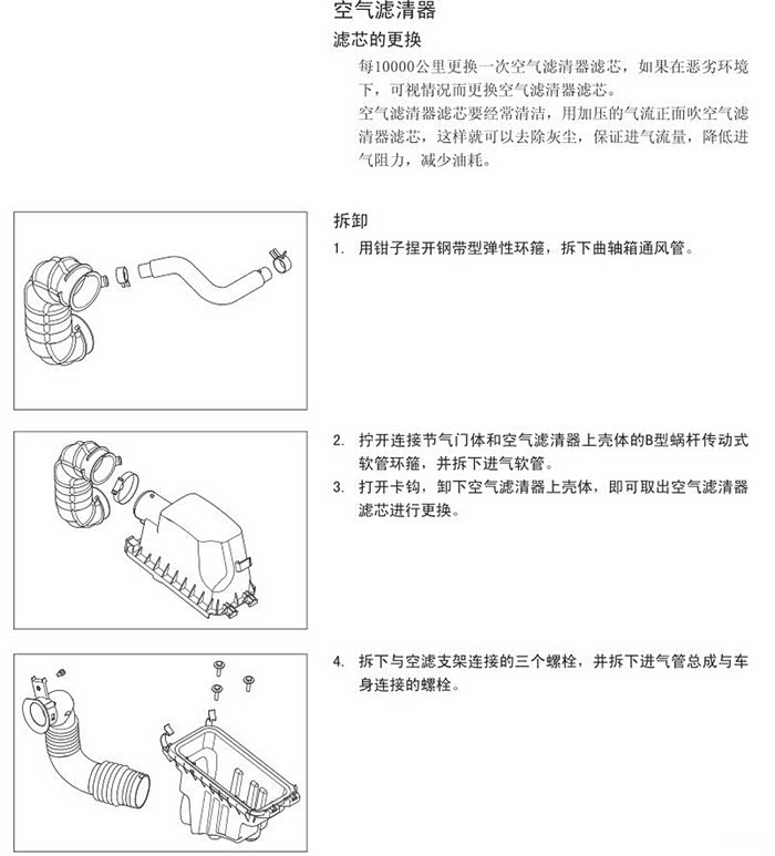 空滤特好换,8MM扳手或一字螺丝刀松开管箍,扳开空滤盒前角的2个钢卡就行。