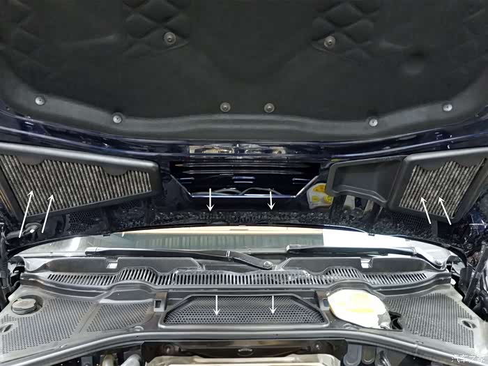 空调滤芯被设计到了你做梦也想不到的地方,和引擎盖整合在了一起。图中的箭头指向是气流的走向,空气经过发动机舱左右的翼子板处进来经过空调滤芯,再到中间汇合然后到防火墙进入到驾驶室的内部。并且全车只有这两个空调滤芯,并没有内置的空调滤芯,看来欧陆对它的活性碳材质的空调滤芯非常有信心啊!