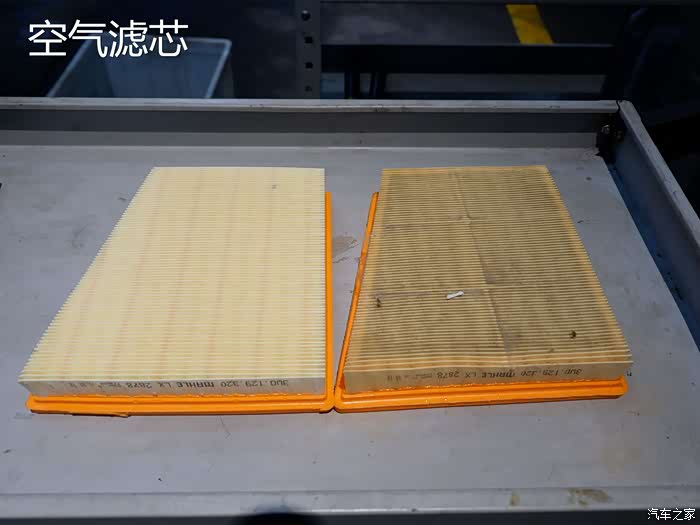 在欧陆GT的发动机上一共是有两个空气滤芯的,为了进行更加鲜明的对比。我将新旧空气滤芯各拿了一个,差距还是很明显的。