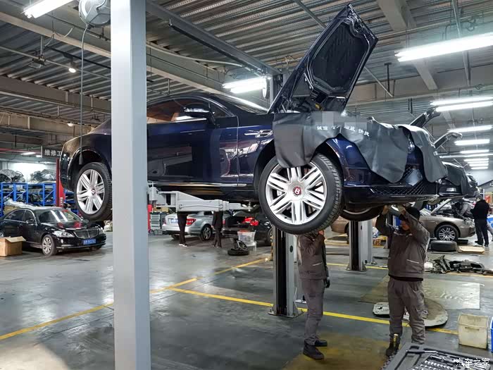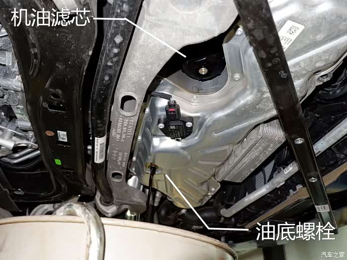 由于是采用重力换油法,必须要拆卸掉发动机的护板。欧陆GT底盘做的异常工整,一块硕大的发动机护板直接罩在了发动机的底部。在车辆高速行驶,底盘越平滑对车身的整流能力越强,所以你会看到几乎所有的跑车底盘都是非常工整的。
