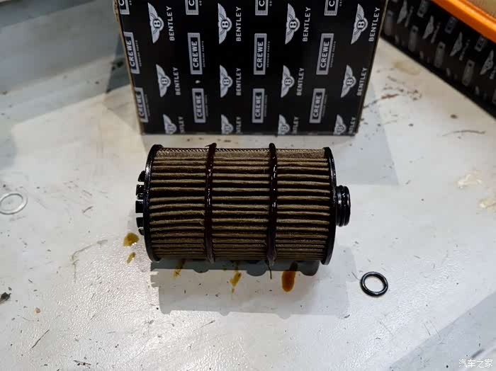 宾利秉承了大众家族的所有基因,通过机油滤芯也不难发现。在机油滤芯的上盖处一共有两个密封圈需要进行更换,这个位置是奥迪车型机油常见渗漏之一,不知道在宾利上是不是这样。