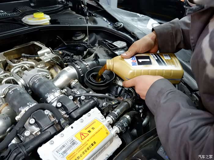 机油加注口比较容易找到了,就在发动机舱的左侧。机油采用的是来自美国的美孚,金美孚是美孚旗下的顶级机油,全合成系列更换周期在一万公里左右。型号是0W40,抗低温能力非常优秀。北方地区对机油的冷启动能力要求十分严苛,建议使用0W型号系列的机油。哦对了,这台发动机一共加注了差不多九升左右的机油。