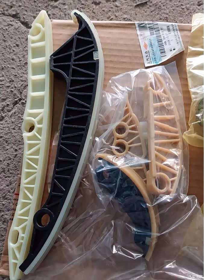 这是改进后的正时链条导轨套装。正时链条导轨,看似很不起眼的几个塑料板,但是在更换正是套装时,是必须一起更换的。因为旧的正时链条导轨,存在一定程度的磨损,磨损后会导致无法与新链条磨合,出现隐患。所以本着严谨的态度,正时链条导轨必须一起更换!