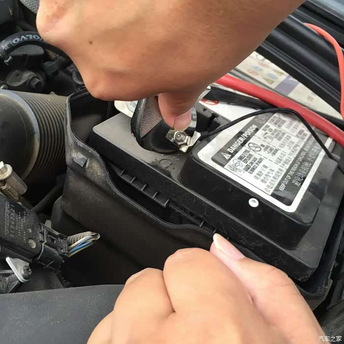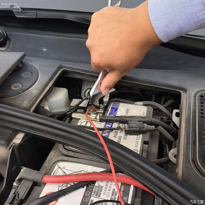 第二步,就是找到汽车电瓶的正负极,红色加号为正,黑色减号为负,用活动扳手,稍微将正负极螺丝扭松一点点(我这根电源线是反的,做线的工人打端子时接反。)