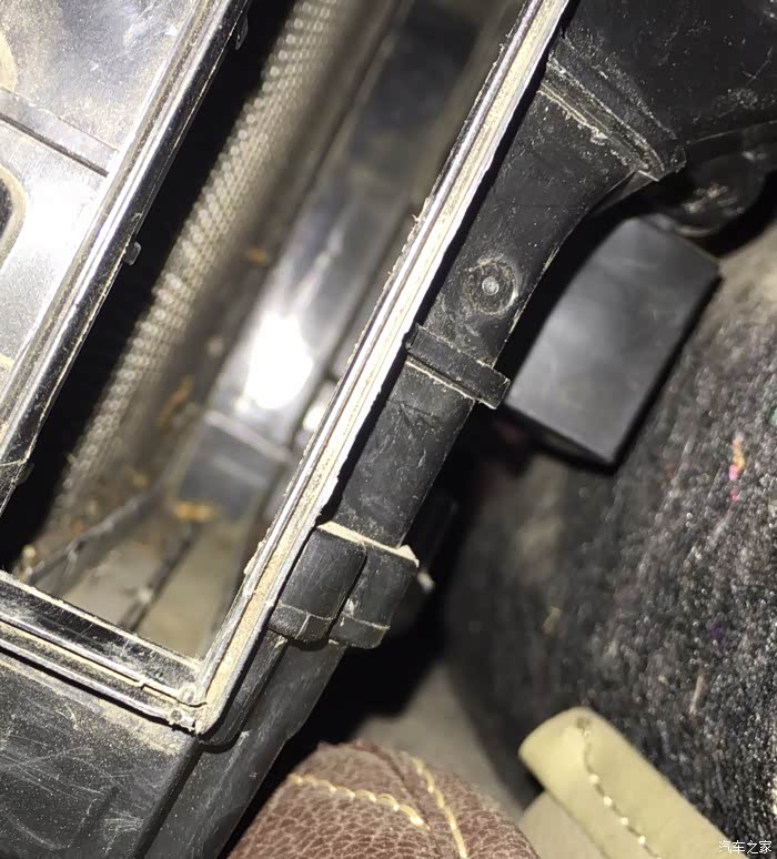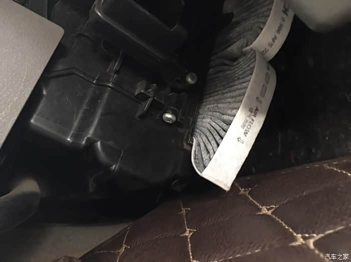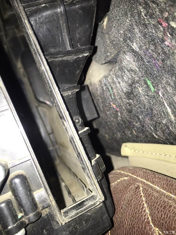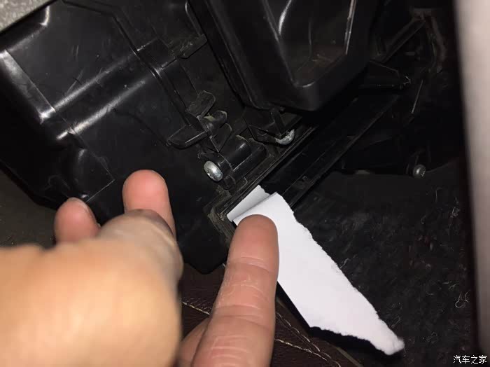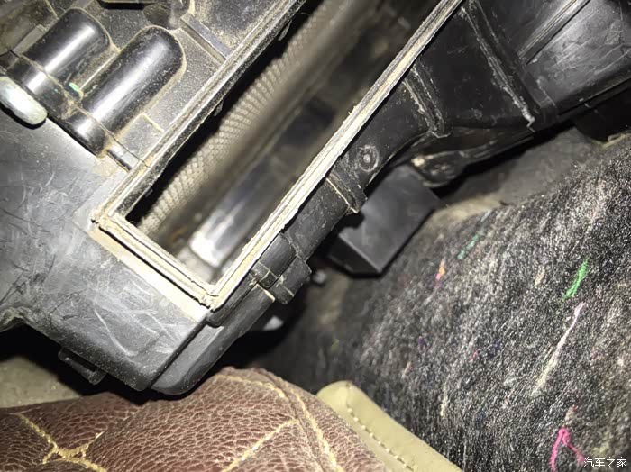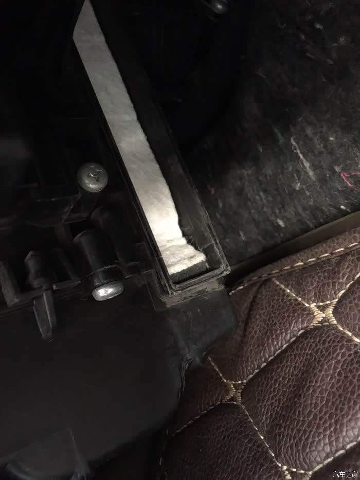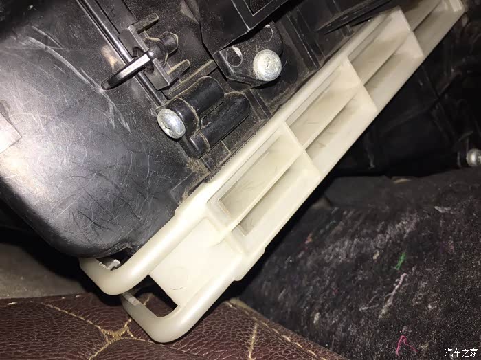看见这个白白的盖子?这就是滤芯盒盖子,需要动手取下来,里面就是旧空调滤芯。实际操作中,小伙伴们就要想想办法了,因为要取下这个盖子,必须要躺在副驾驶地板上,才能看见。自己动手操作的小伙伴就要委屈一下啦哈