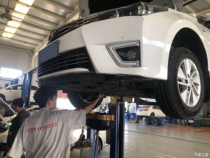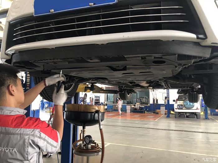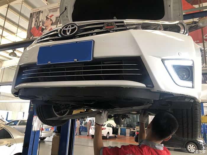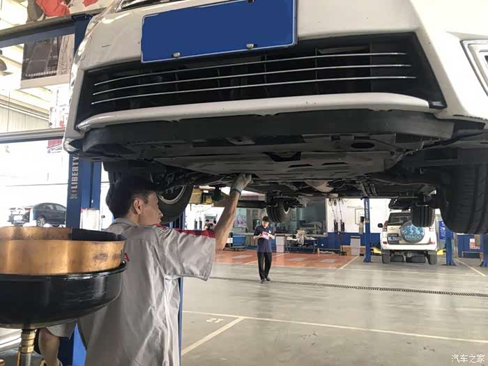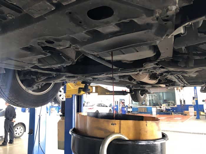 师傅正在检查小白的底盘,看看有没有磕碰,螺丝有没有松动什么的,还有一点最重要的是胎压是否正常。另外,还要把原来的机油从下面放出来。
