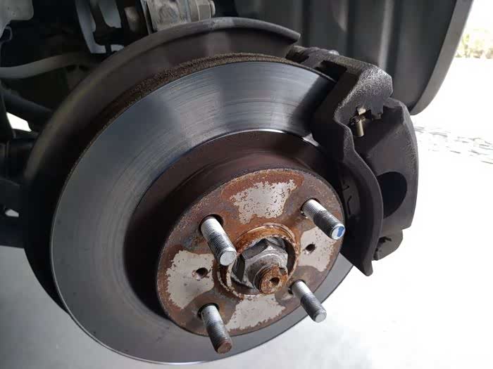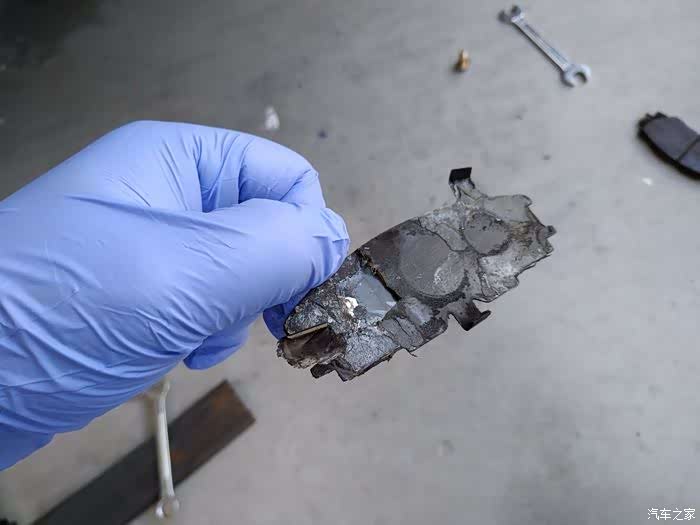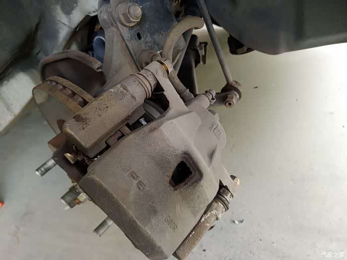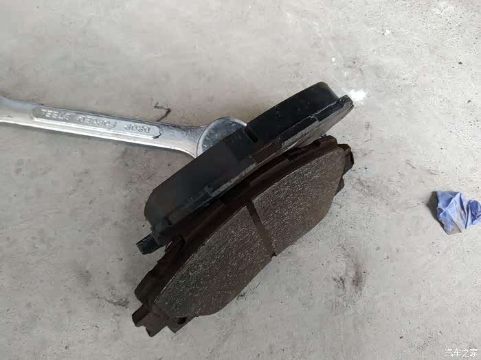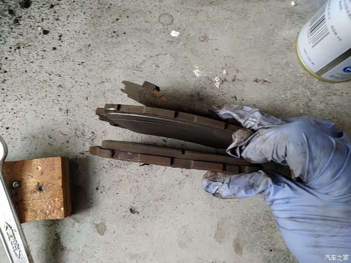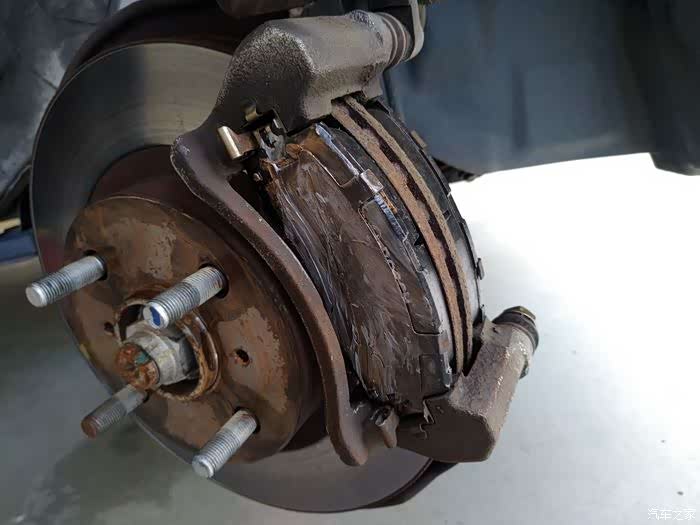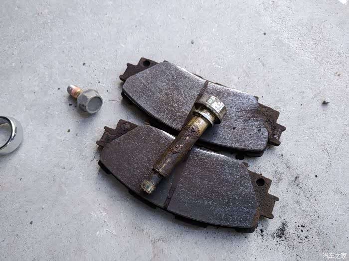 自驾前自己还对车辆做个检查,前后刹车片看外侧的情况都还很好。这下啸叫声又起,一定是导向销进水生锈了不能滑动了。外侧刹车片没事,那就一定是内侧的刹车片磨光了。