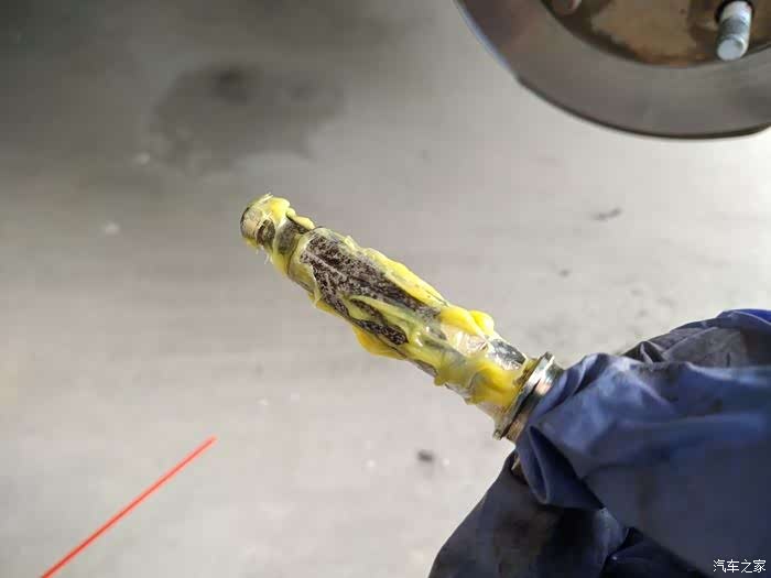 这种润滑脂是铜色的,应该是含有铜粉这一材质。不让铁和铝直接产生电化学反应从而咬死轮毂。下面的导向销完全无法活动了,只能转动但也很紧。