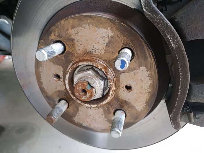 锁紧,右侧的完毕。轮胎螺母扣上,等落地后按扭矩拧紧。左侧的保养雷同,就是锈蚀的更厉害,用原本的方法根本就不出来。那次内蒙自驾游,左前轮掉入过泥水坑。所以通身全是铁锈。