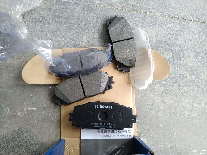 4片前刹车片,都是一样的不分左右,套装内东西挺齐全的,大瓶的是清洁剂,3支小牙膏是:+消音膏+导向销/防咬合润滑脂。在顶升前把轮胎螺丝拧松一圈,19MM套筒。