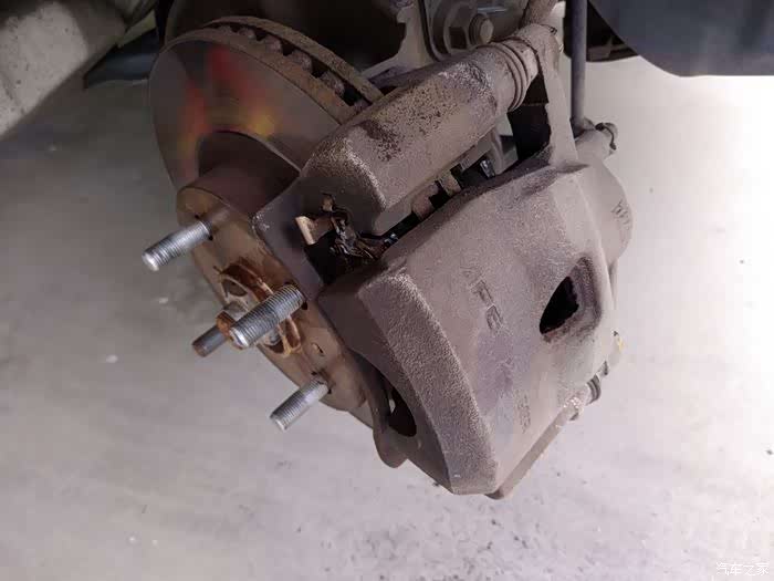 左侧看刹车片就能发现问题,偏磨得很严重。内侧片都基本见铁了。