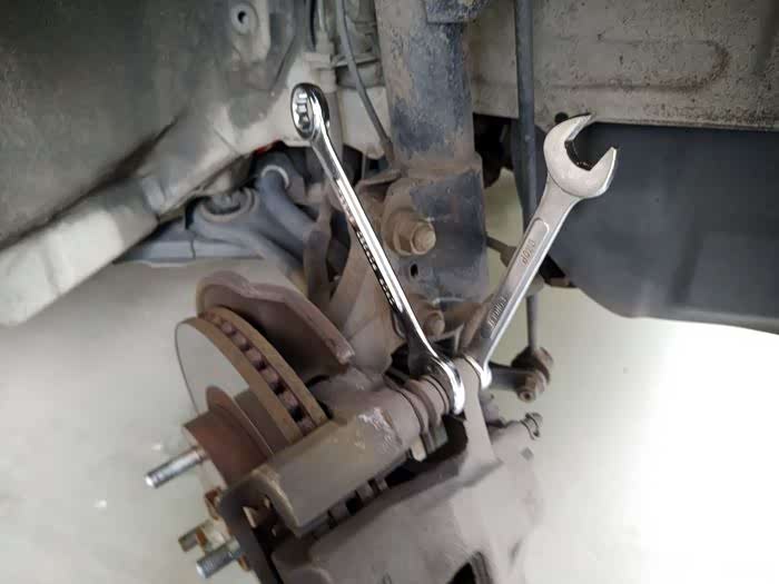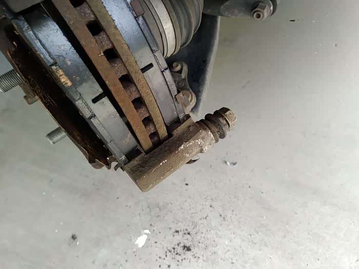 新片上身后就要解决下方导向销锈蚀的问题了,润滑良好的上方导向销稍用点力就拔出,清理干净加润滑膏就行。锈蚀的是拉不动只能用扳手稍稍转动。
