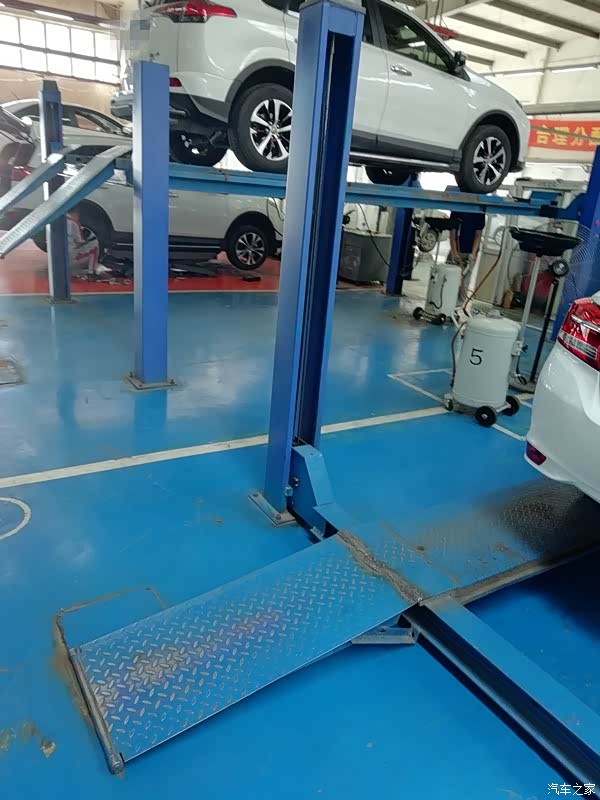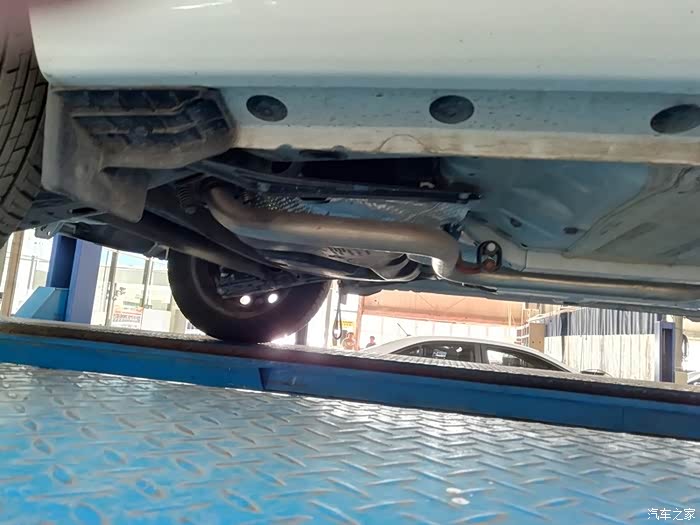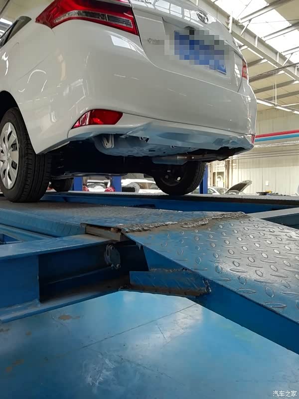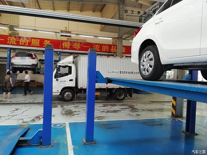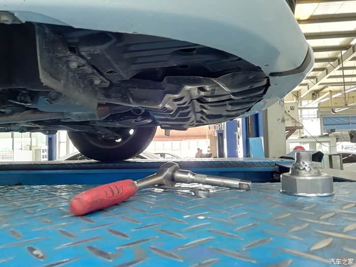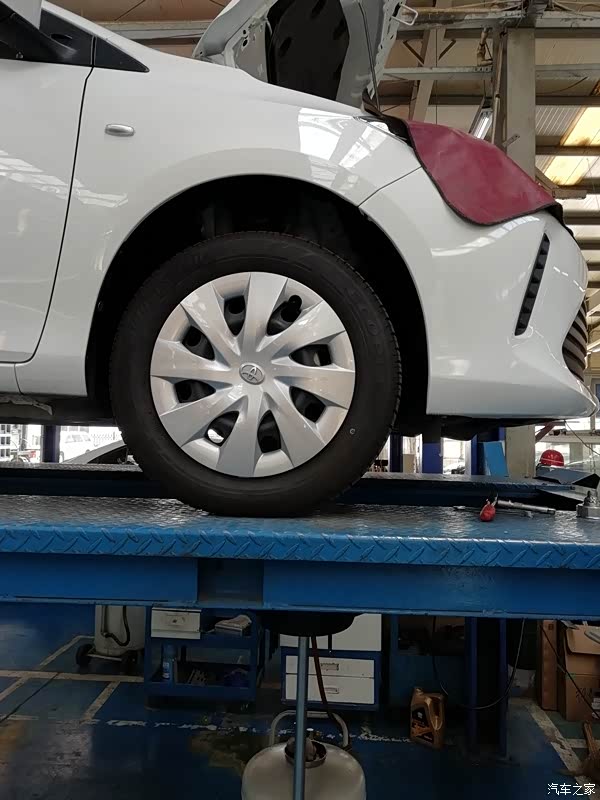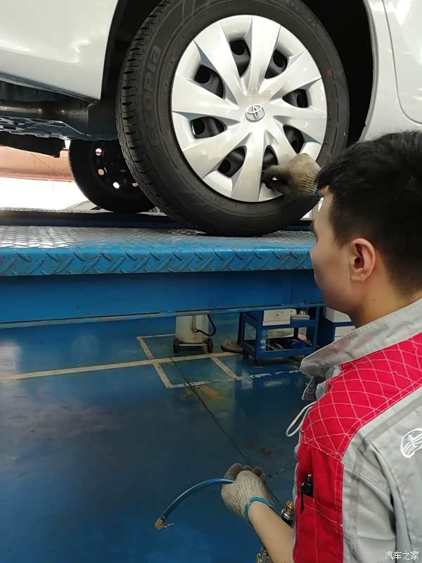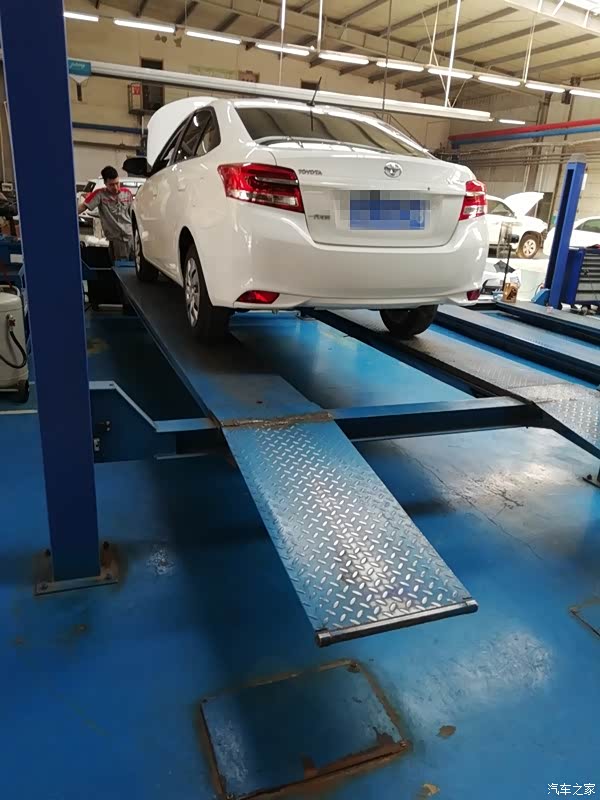 把车检查了一遍后,记录了一下外观的情况以及公里数,还用塑料把主驾驶座椅位置罩上了,在主副驾驶下方也垫了一张华通丰田的牛皮纸张,真是非常的为客户着想,很专业!接下来,师傅接过我的车钥匙,把车开到了维修保养车间,用架机把我的时尚威架了起来,准备开始作业!