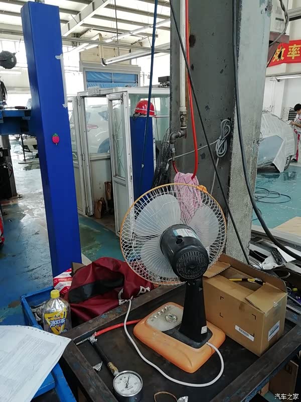 接下来,师傅打开了发动机舱,准备用气枪给发动机舱内除除灰尘,真的是很用心。