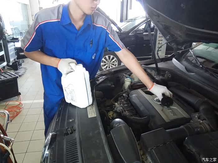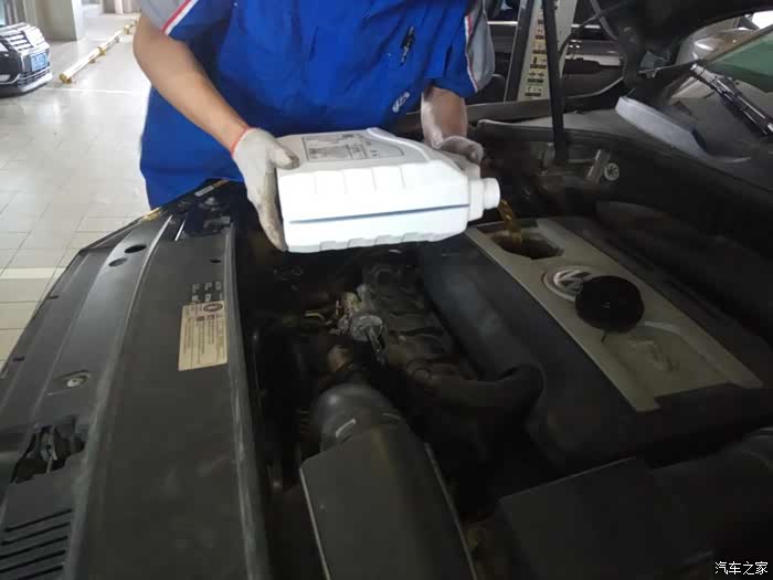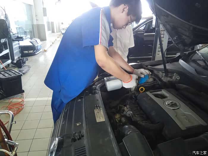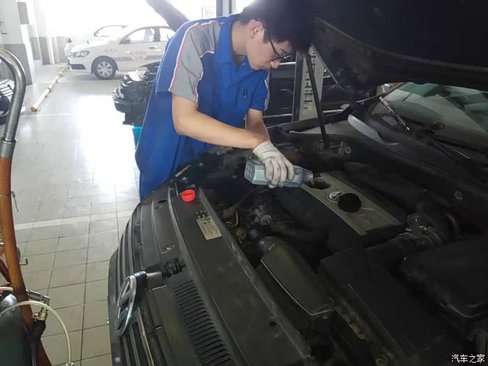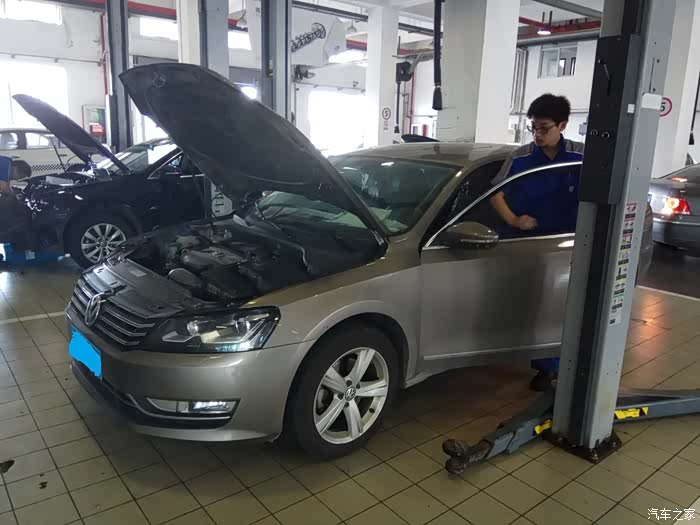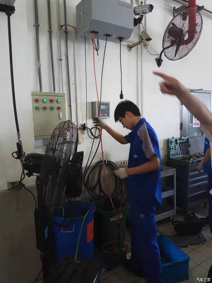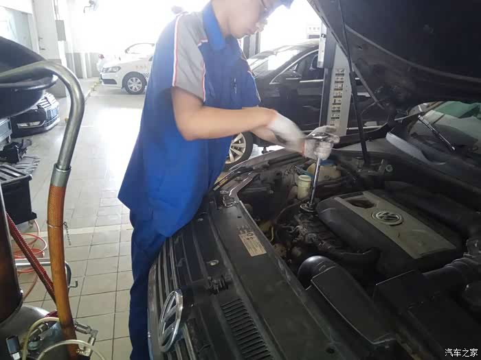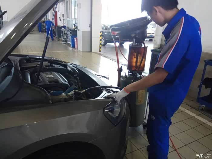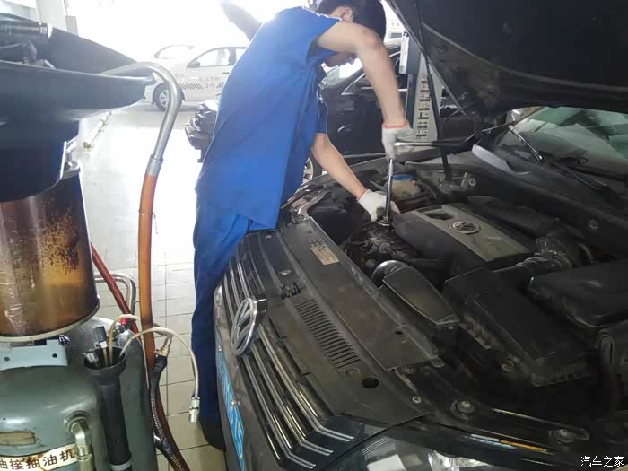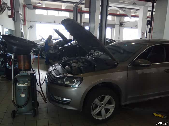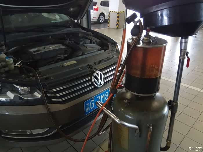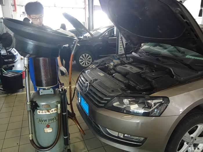 这是开始换机油了,和别的车不一样啊,Polo之类的都是升起来放机油的,新帕到是要用机器把机油抽出来。