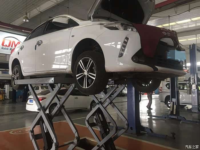 四个垫子垫好后工作人员打开了前机器盖,在前保险杠的一圈围上了保护的垫子,缓慢的升起了我的爱车,我的小威高高升起来,准备看看小威的地盘。