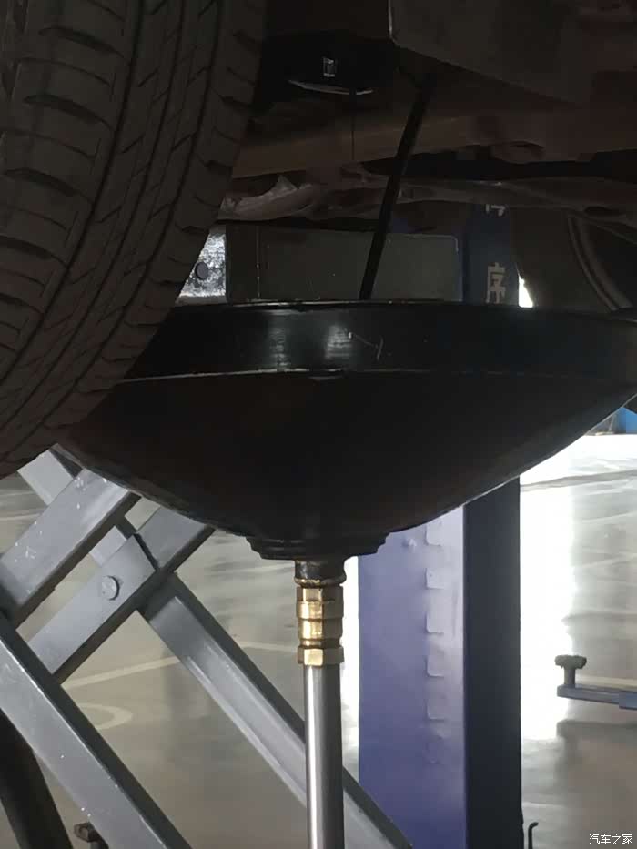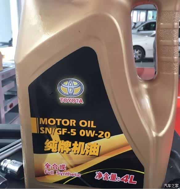 车被缓慢的降了下来,看来是准备往车里注入新的机油了,师傅又去拿来了一桶机油,0-20的机油,应该是散装的大桶机油装入的小桶,反正之前听说店里的丰田机油都是大桶的散装。