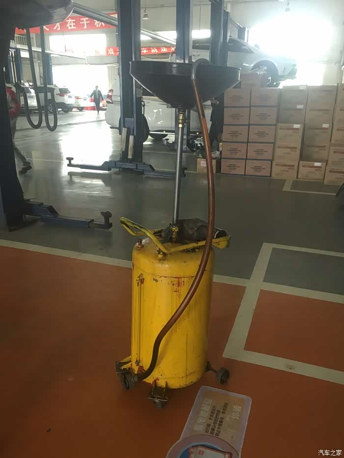 保养的师傅拿来的接油的容器,准备放掉车内的机油。