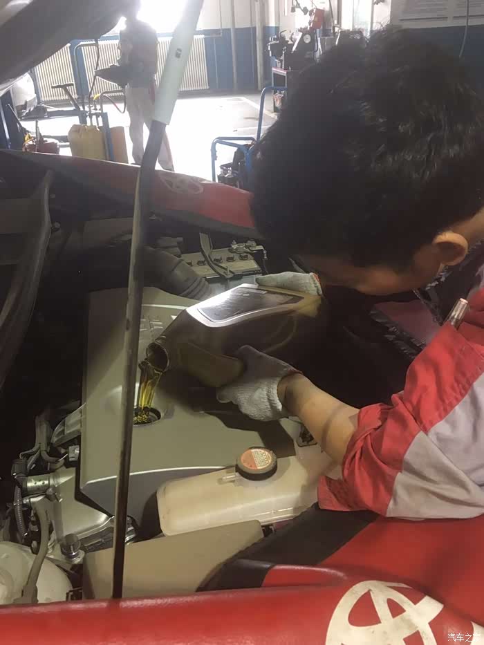 师傅小心翼翼的加进去机油