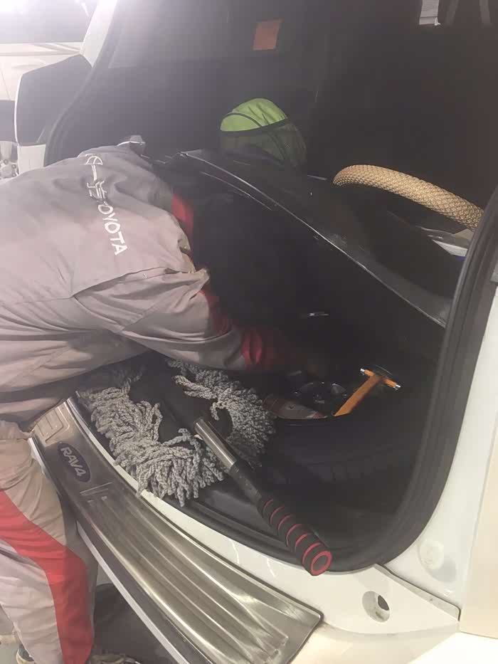 师傅很细心的检查后备箱,还有后备箱里的轮胎,基础的保养都做好了。