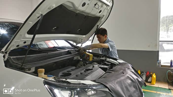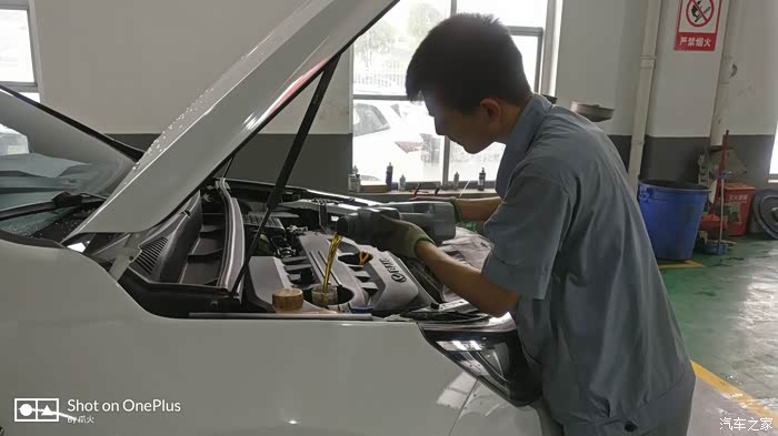 四升的机油还剩了一点,师傅都说了可能还完全放不干净的。加入了新鲜的机油之后师傅拔出机油尺检查了,差不多机油就在上下刻度的中间。之后有升起了小六,再次检查了机油螺母和机油滤芯看看是否有渗漏的现象,确定没有了。