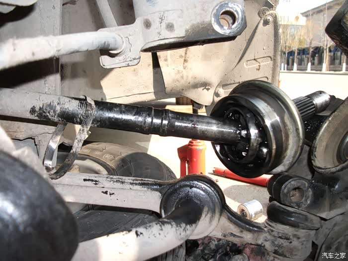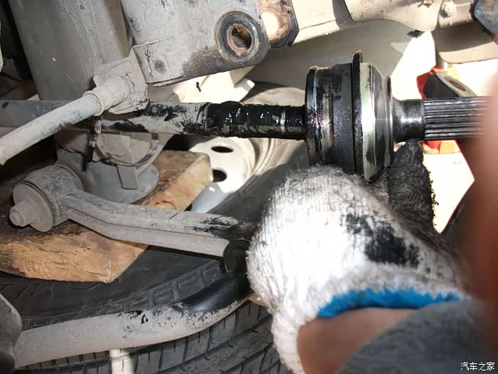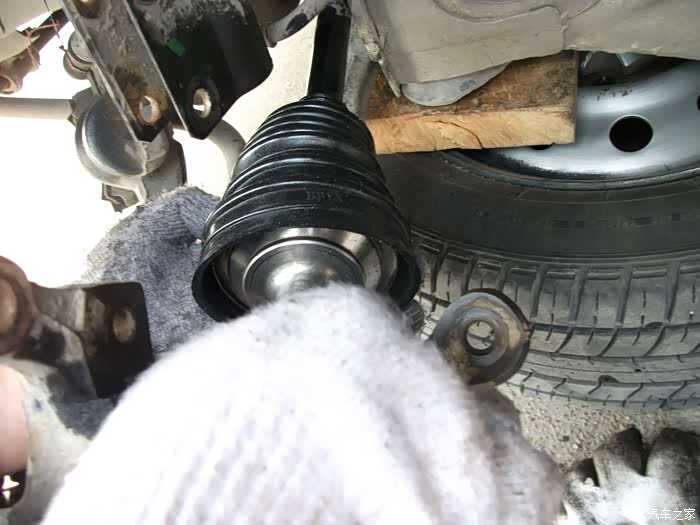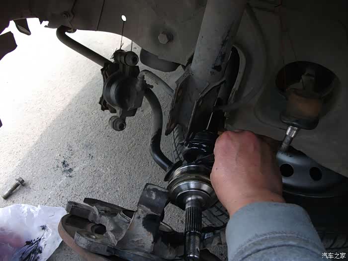 已经推出左半轴球笼---------另一头的内球笼还 连着呢--------所以,不可用力过大防止拉掉。