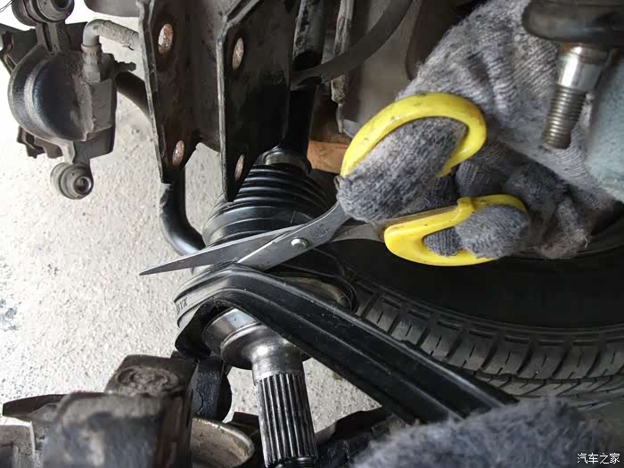 把破损的防尘套清理下来,再擦干净,用小剪刀等工具。
