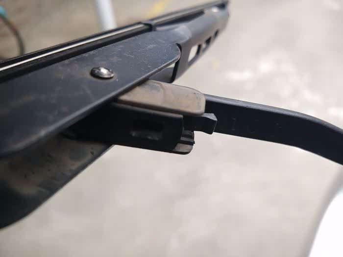 U型雨刮臂由于是垂直安放的,也是怕掉落雨刮上设置了防脱落的卡扣