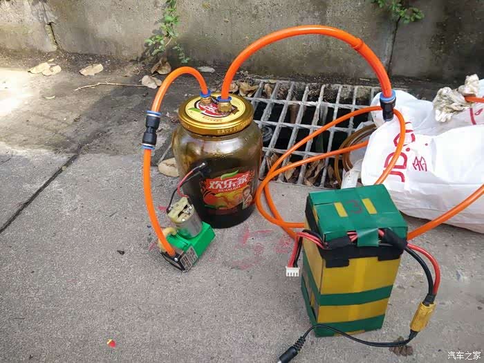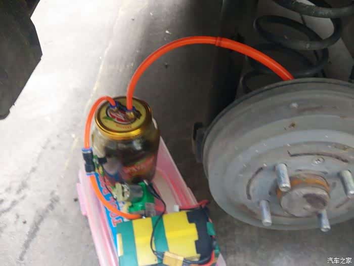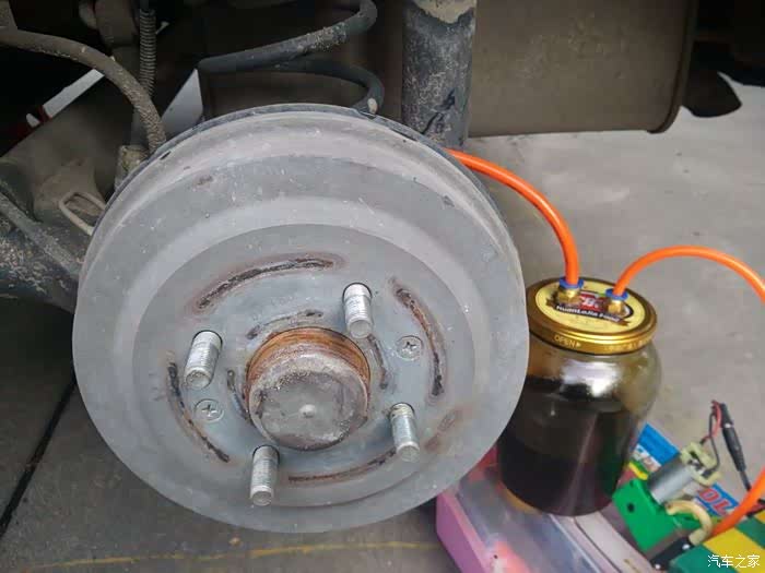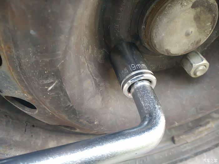 8MM气动管套上,一开始以为放油阀不是8MM就是10MM,没想到都不是,是的9MM的。只能借把小的活动扳手,开抽拧松放油阀。出新油了锁紧。