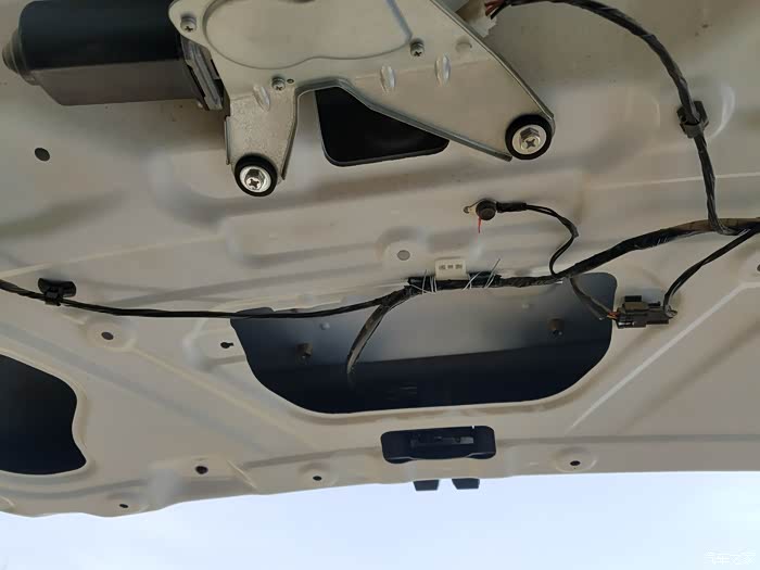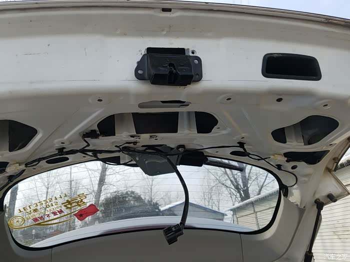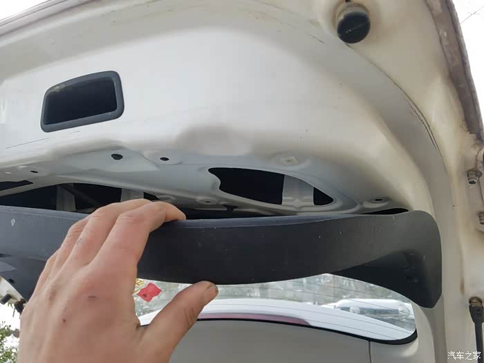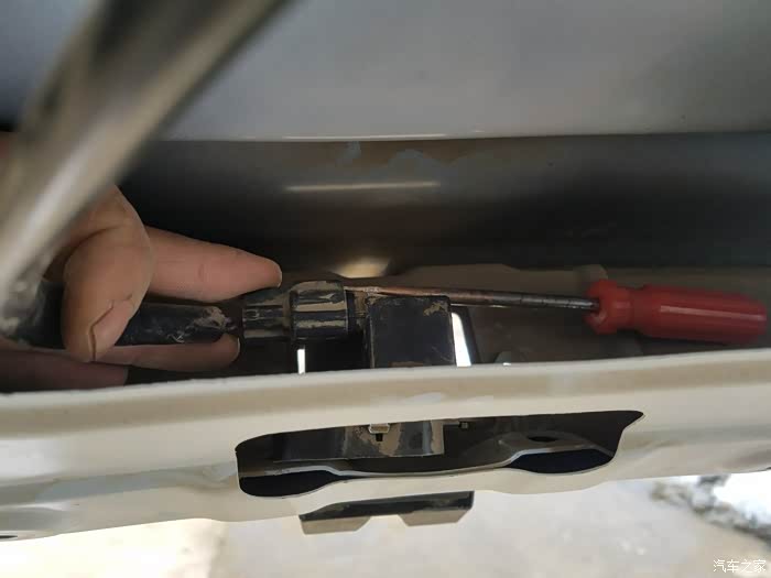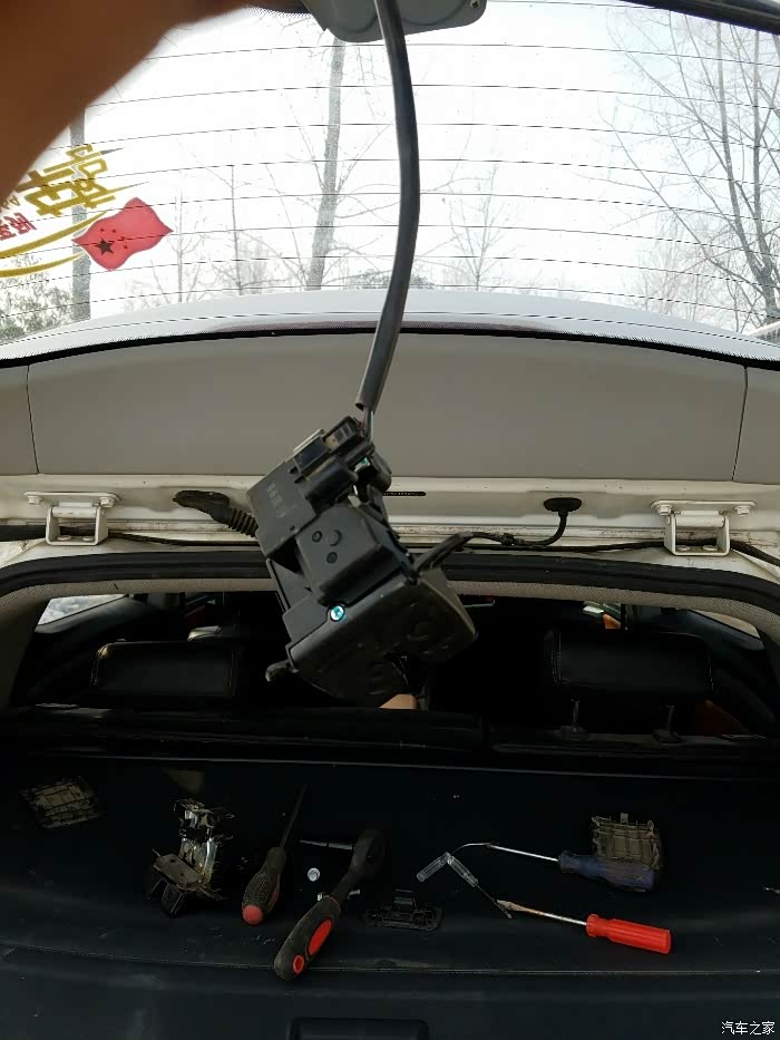 准备取下坏了的锁块。可是楼主走进了一个误区,在这个状态下,锁块是不可能拿出来的,于是楼主很下心来,准备把后备箱的内饰板拆下来。