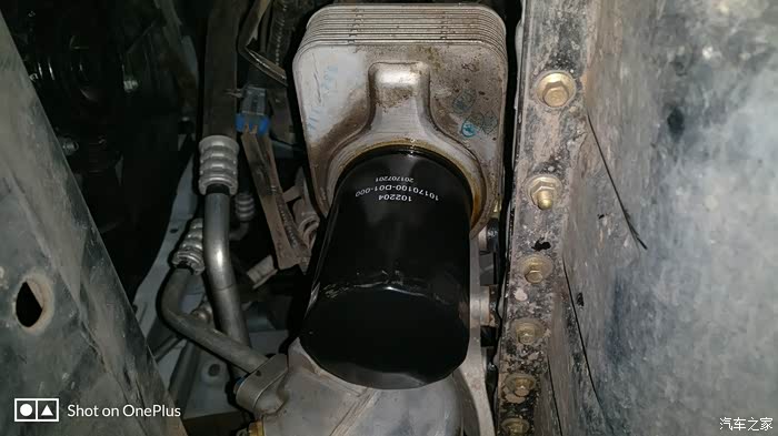 这是师傅在给机油滤清器里面倒一点机油,让先润一润这样会好一点。师傅取下来旧的机油滤清器。
