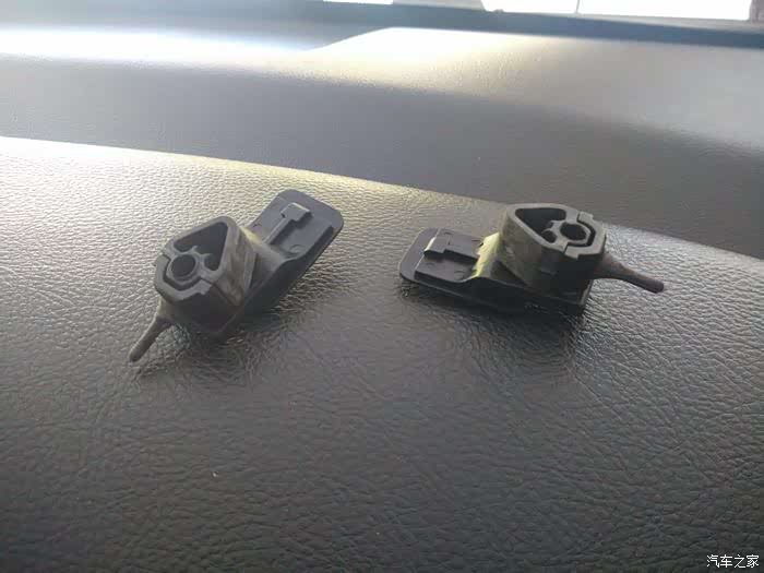 扳开2侧黑色卡扣,先把卡扣向车尾方向推动,同时向手套箱内部撬起。把橡胶件全部挪入手套箱,卡扣就能拆下了。