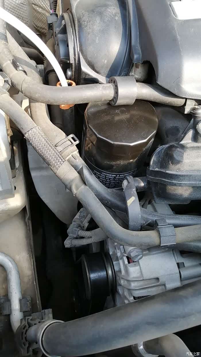 合计大致抽出4.7升以上机油,这时候徒手用力旋下机滤,将机滤孔周边旧油再抽抽后旋入新的机滤,扳手没用上。