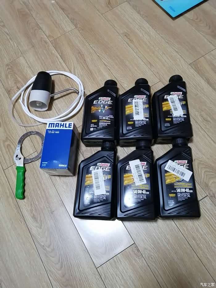 全家福拍照展示下,狮子家直营国际购买的机油,0-40,粘度13.5,5瓶美国生产,1瓶比利时生产,都是打折促销时段买的,大致是39元一瓶(含税、包邮),马勒官方旗舰店买的机滤27元,机油扳手9元包邮(这次没用上)。