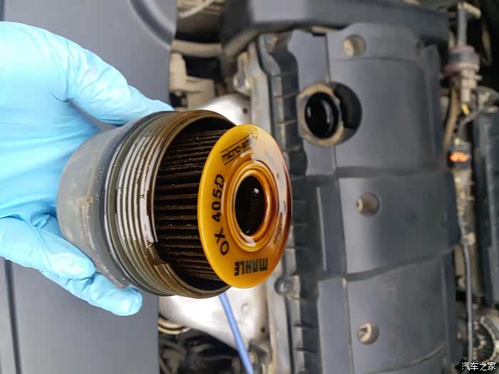 放得差不多了,开始拆机滤,熟能生巧,这次没垫东西,废机油几乎一滴没撒。机滤在上面的,拆装就是方便