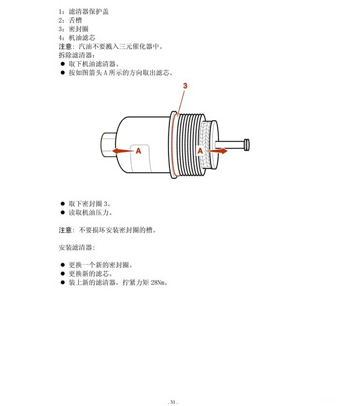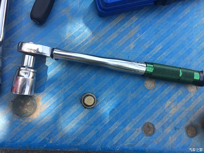 按手册要求,扭矩扳手设定28NM。锁紧机滤盖,和开始记录下的标记线做对比。原本的上的明显过紧了