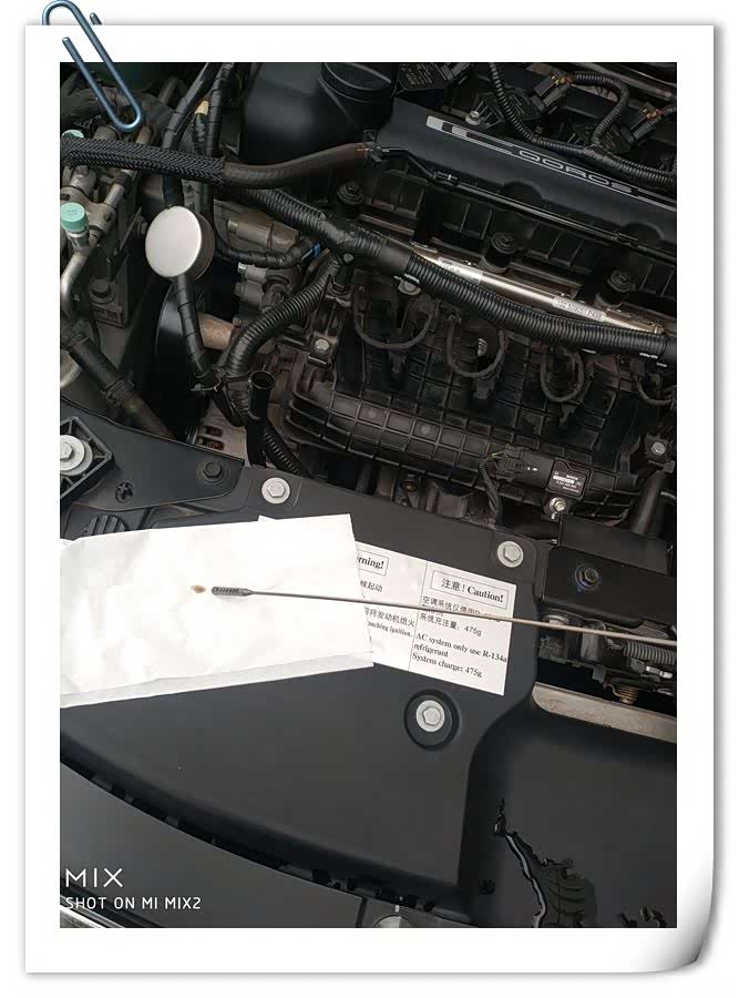 盖好机油盖,点火启动,发动机正常运行,怠速声音感觉跟之前的福斯没啥区别嘛;熄火3分钟,检查下机油尺,好家伙,就超过最下限2格........;