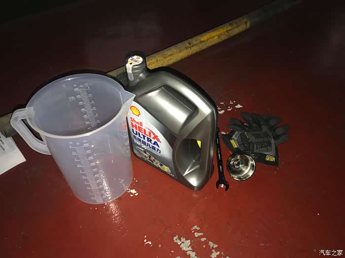 摆好东西,5L的大量杯,壳牌5W30中糙特别版,梅花扳手(千万不能用活动扳手,不然螺丝滑了就麻烦了),机滤帽,手套(这个应该提倡每一个DIYer必备的产品,我用的是超级技师这个牌子,超舒服,一对普通的也就一百出头,非常好用),扭力扳手(这个没出镜,用来拧机滤和放油螺丝)