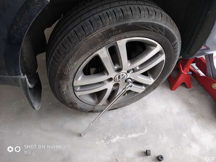 这轮胎上回去修理厂更换的刹车盘和刹车片,又是用风炮拧的。我的长柄F杆没能直接撼动,需要整个人踩上面才颠松。你让一般的车主半路上怎么换备胎。