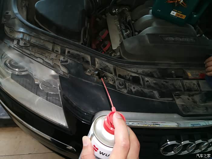 前机盖锁钩润滑,尤其是多机盖锁车辆,一定要定期润滑,否则会出现盖不上发动机盖的情况(比如奥迪c7)。