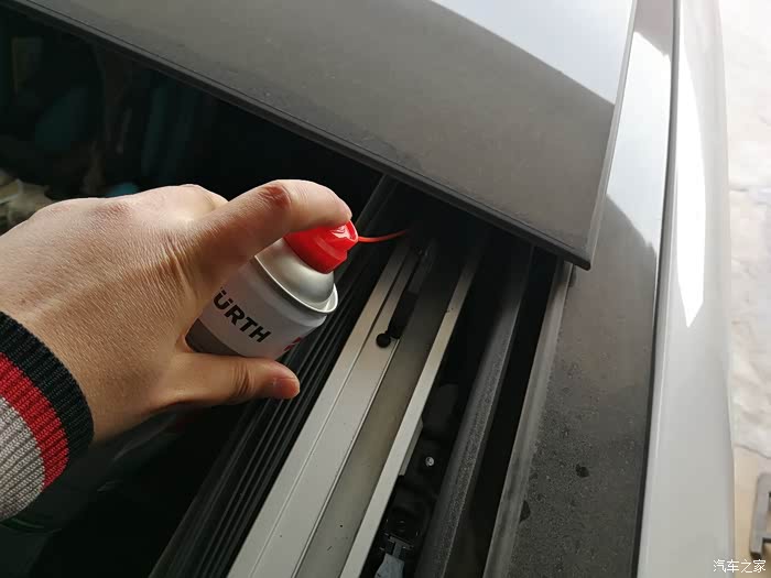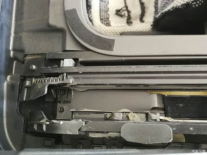 对天窗的润滑,随着车龄的增加,天窗内润滑脂会失效,同时受到灰尘污染,严重会开天窗异响,天窗开启阻力增大,甚至卡滞。这个时候需要我们对天窗进行清洁,润滑。这张图片是原厂润滑脂混合灰尘后的模样。