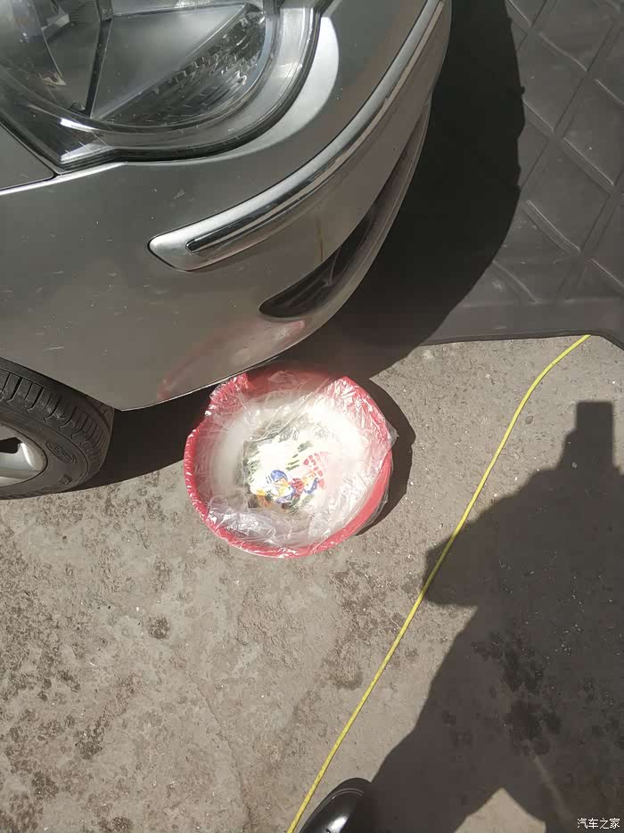 临时找个塑胶袋套上不用的家传宝盆,再铺上后备箱垫子准备接油!