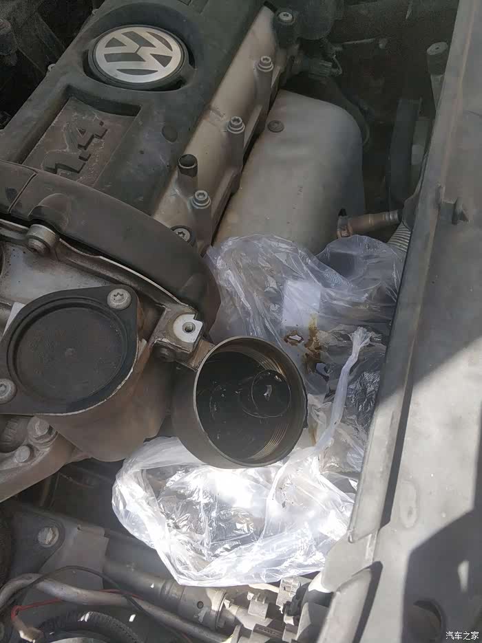 趁着放油把机滤换了,这款车的机滤是在上面的,我给他准备了马勒机滤,这个机油帽一般是用32号套筒拧下,因为我的工具不见了(不用的时候天天碍眼,一用找不到了,NN的,这是什么定律),所以用活口扳手拧下来的。拧的时候铺上塑胶袋,防止滴油污染发电机。