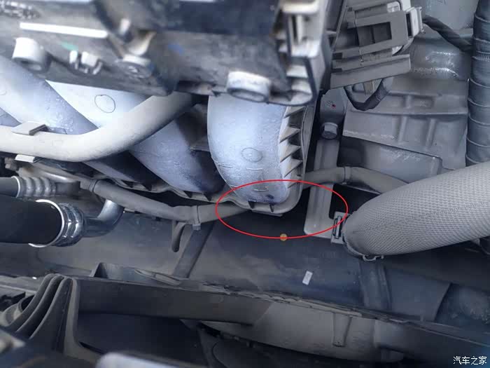 机油滤就在散热风扇后面(红圈部位),像我们这样没有顶升机的话,肯定上从上面拆,就是手臂要受点罪。
